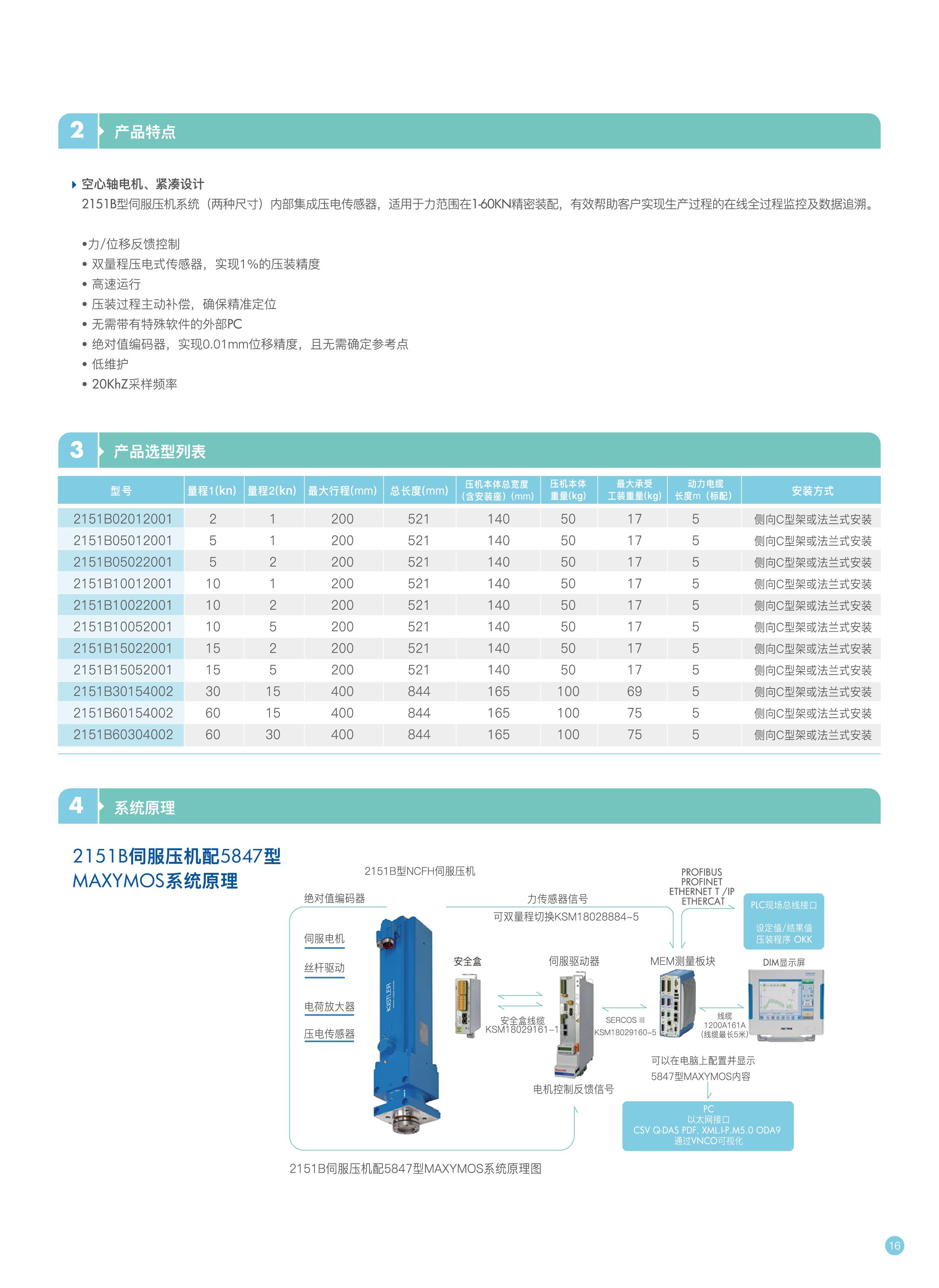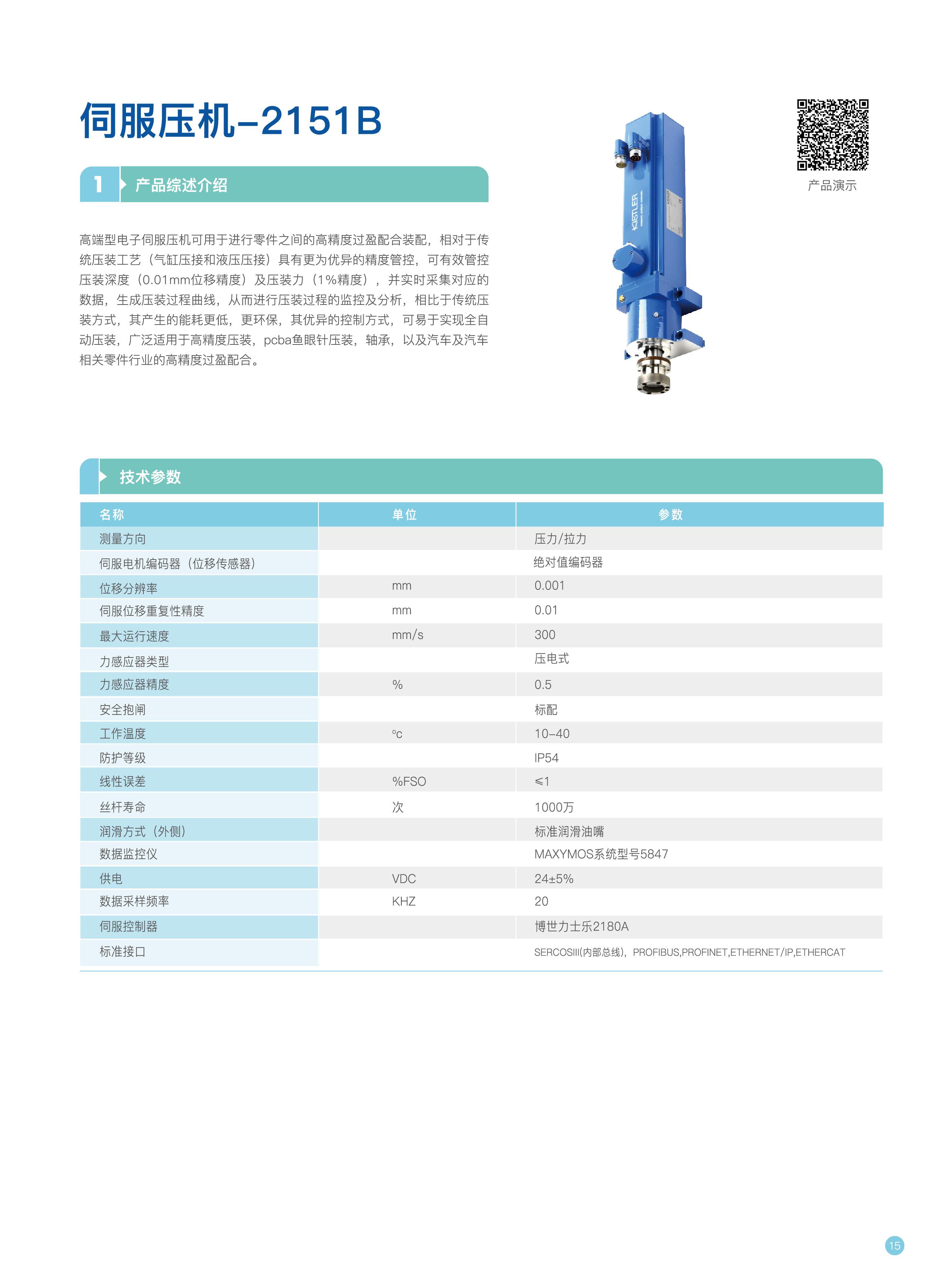 奇石樂(kistler)高精度電子伺服壓機2151B,内置雙量程壓電式傳感器,可實現多個不同量程範圍的高精度壓接,壓力精度高達1%,位移精度高達0.01MM,可節省能耗高達80%,不低於1000萬次壓裝,壓裝速度最快可達300mm/s